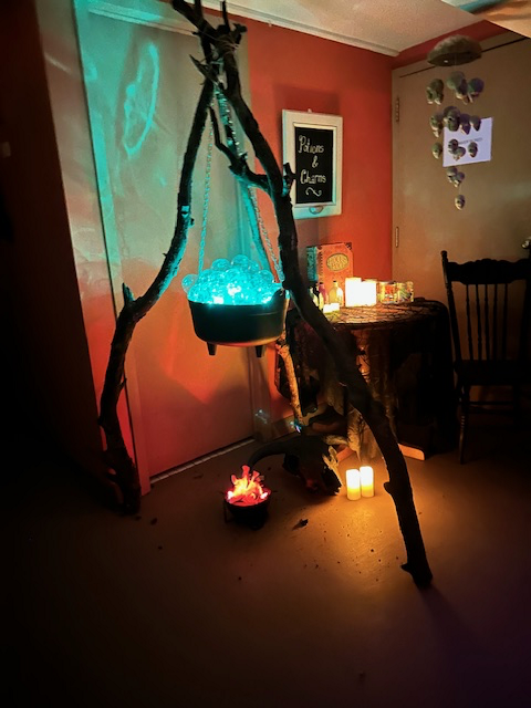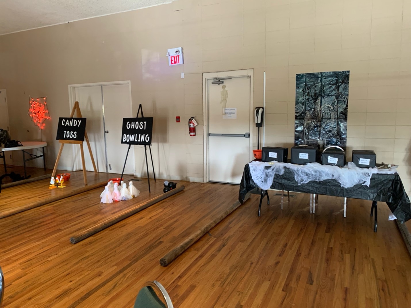 The main hall was decorated with all kinds of Halloween themed games and foods. The Witches Hat Toss, Pumpkin Toss, Eyeball Putt, Ghost Bowling, and Candy Toss were some of the creative and fun games to play and were always rewarded with candy or glow wands. The basement was turned into a scary Haunted House. It was a fabulous set up that provided lots of surprises and scary moments for those that dared to enter.