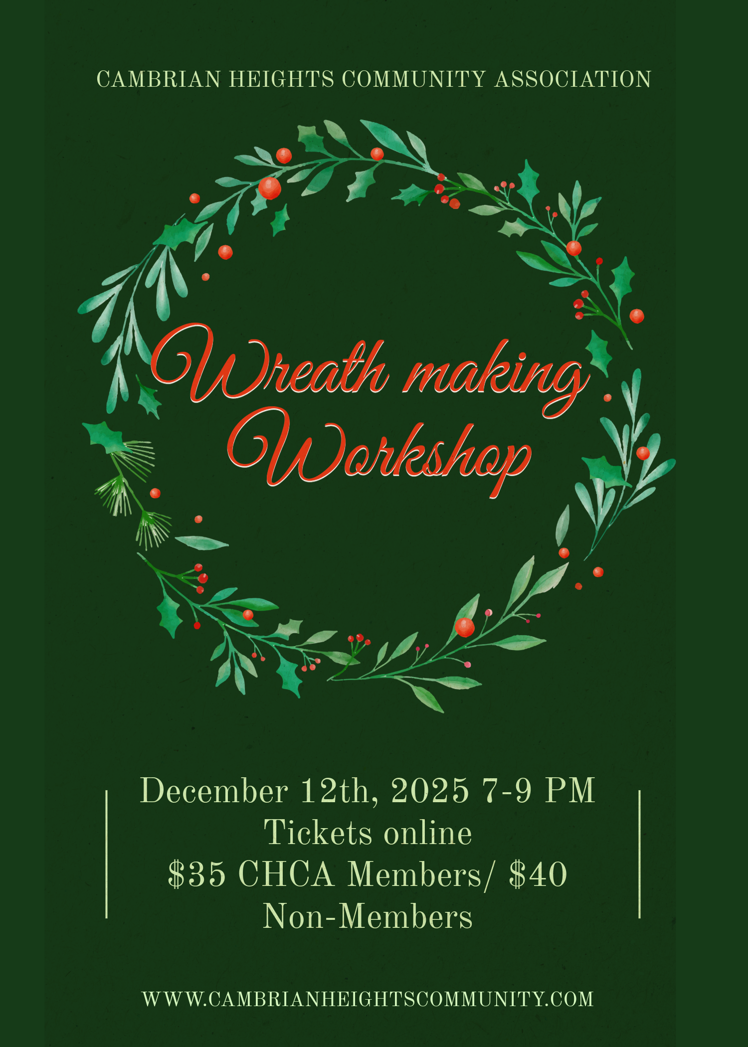 NW CommunitiesCambrian Heights Wreath Making Workshop in Cambrian Heights By Cambrian Heights Community Association - November 30, 2025 0 1 Click here to the Cambrian Heights Community News home page for the latest Cambrian Heights community updates.