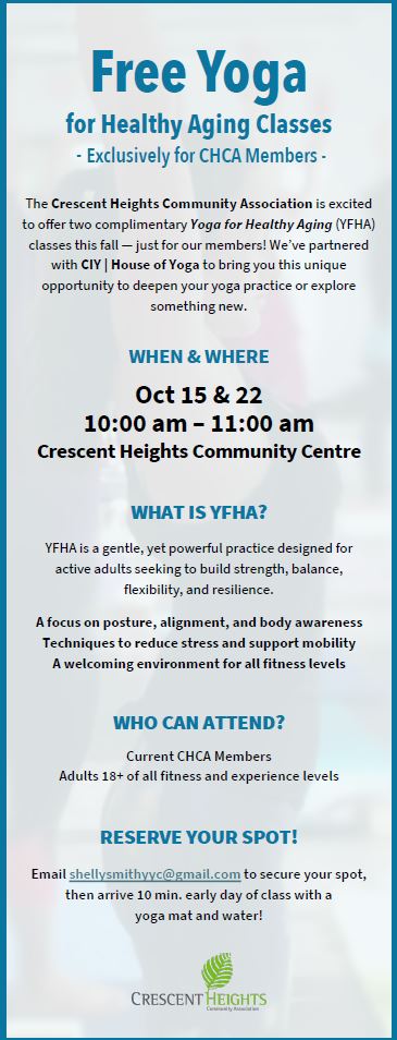 NW CommunitiesCrescent Heights Free Yoga in Crescent Heights By Crescent Heights Community Association - September 30, 2025 0 6 Click here to the Crescent Heights Community News home page for the latest Crescent Heights community updates.
