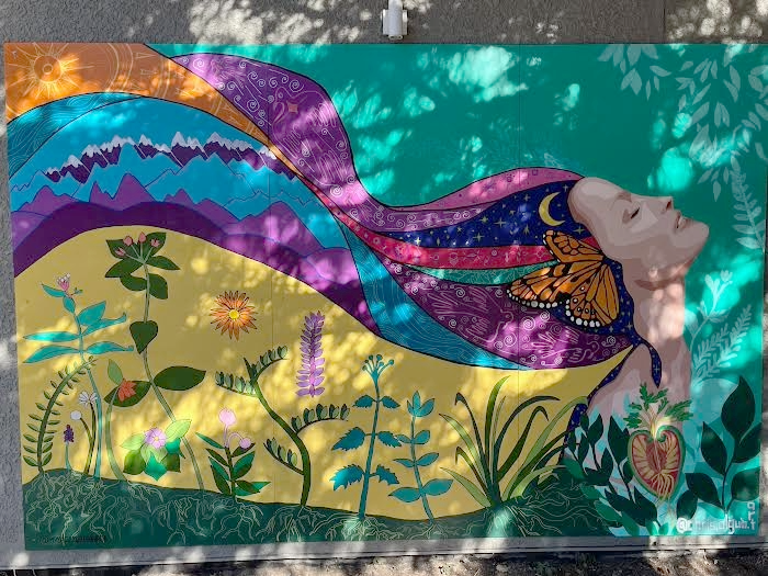 The mural was designed by artist, Chris Olguin, who is a resident of Highland Park. Multiple volunteers collaborated to paint this colourful art piece within the design that Chris created and bring it to fruition. The large mural shows a woman whose peaceful, smiling face is raised up to the sky, with her long hair flowing out behind her, highlighting different connected elements of nature: water, a starry sky, the sun, mountains, birds, pollinators, and native plants. In the bottom right corner of the mural, you can also see the woman’s heart is growing in her chest.