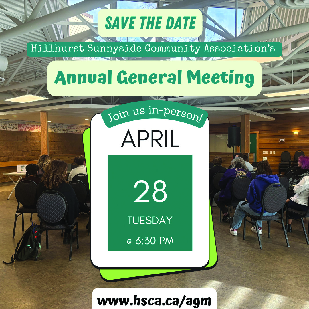 HSCA’s Annual General Meeting (AGM) will take place in person on Tuesday, April 28, 2026, at 6:30 pm at the Hillhurst Sunnyside Community Association.