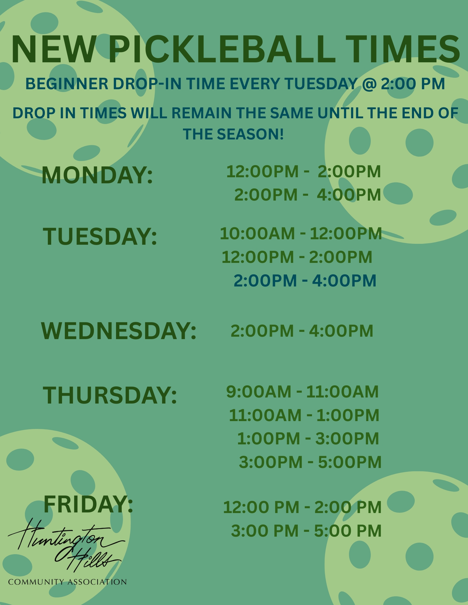 NW CommunitiesHuntington Hills New Pickleball Times in Huntington Hills By Huntington Hills Community Association - October 7, 2025 0 7 Click here to the Huntington Hills Community News home page for the latest Huntington Hills community updates.
