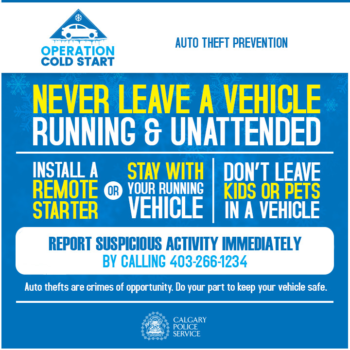 Protect your vehicle this winter and don’t leave your vehicle running and unattended. Car thefts from unattended, running vehicles are preventable. They contribute to the high rates of auto theft within our city and create significant risks to public safety. Citizens who are planning to warm up their vehicle are reminded to: