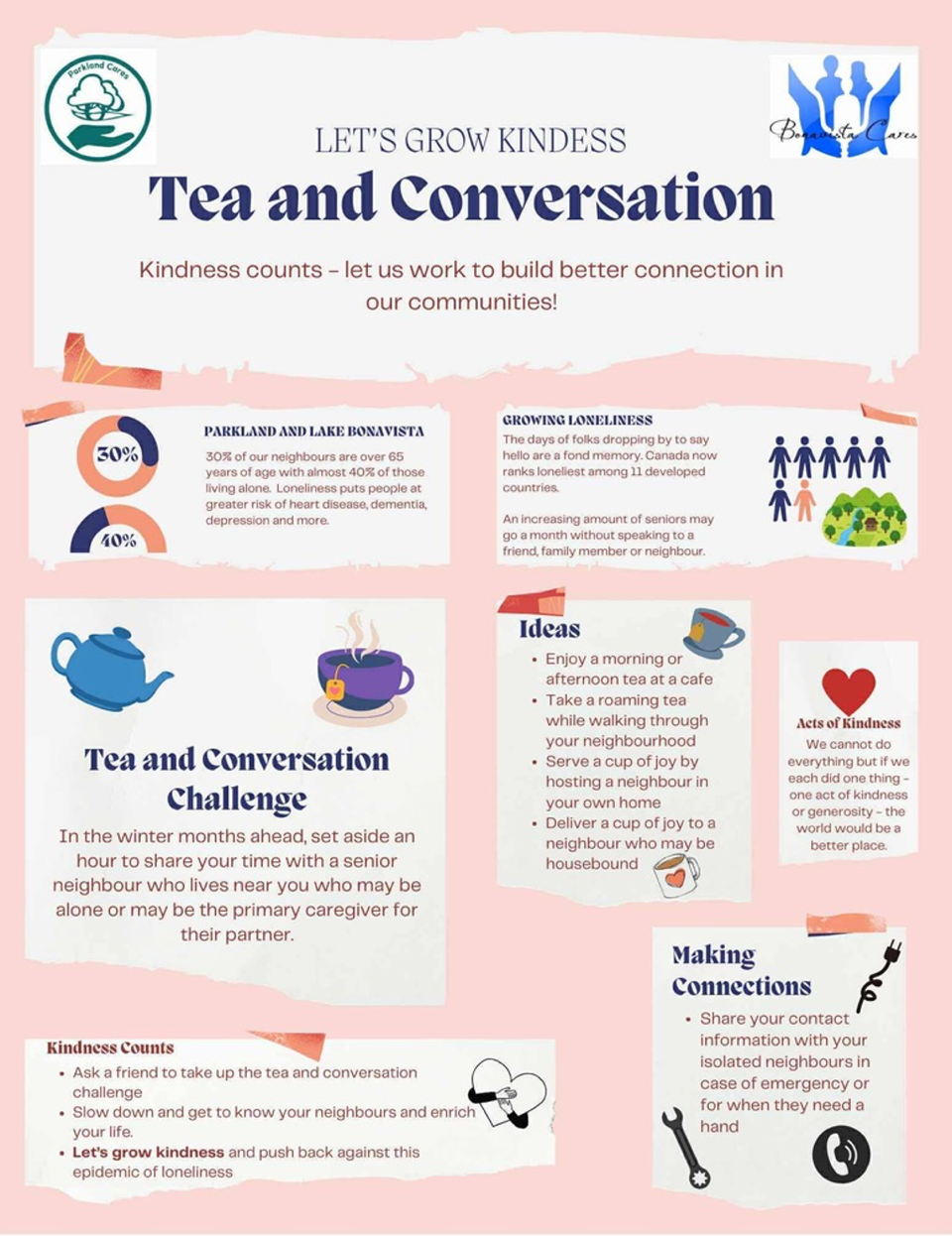 • January to March: Tea and Conversation. In the winter months ahead, set aside an hour to share your time with a senior neighbour who may be alone or may be the primary caregiver for their partner. Make connections, conversations, and push back against senior loneliness.