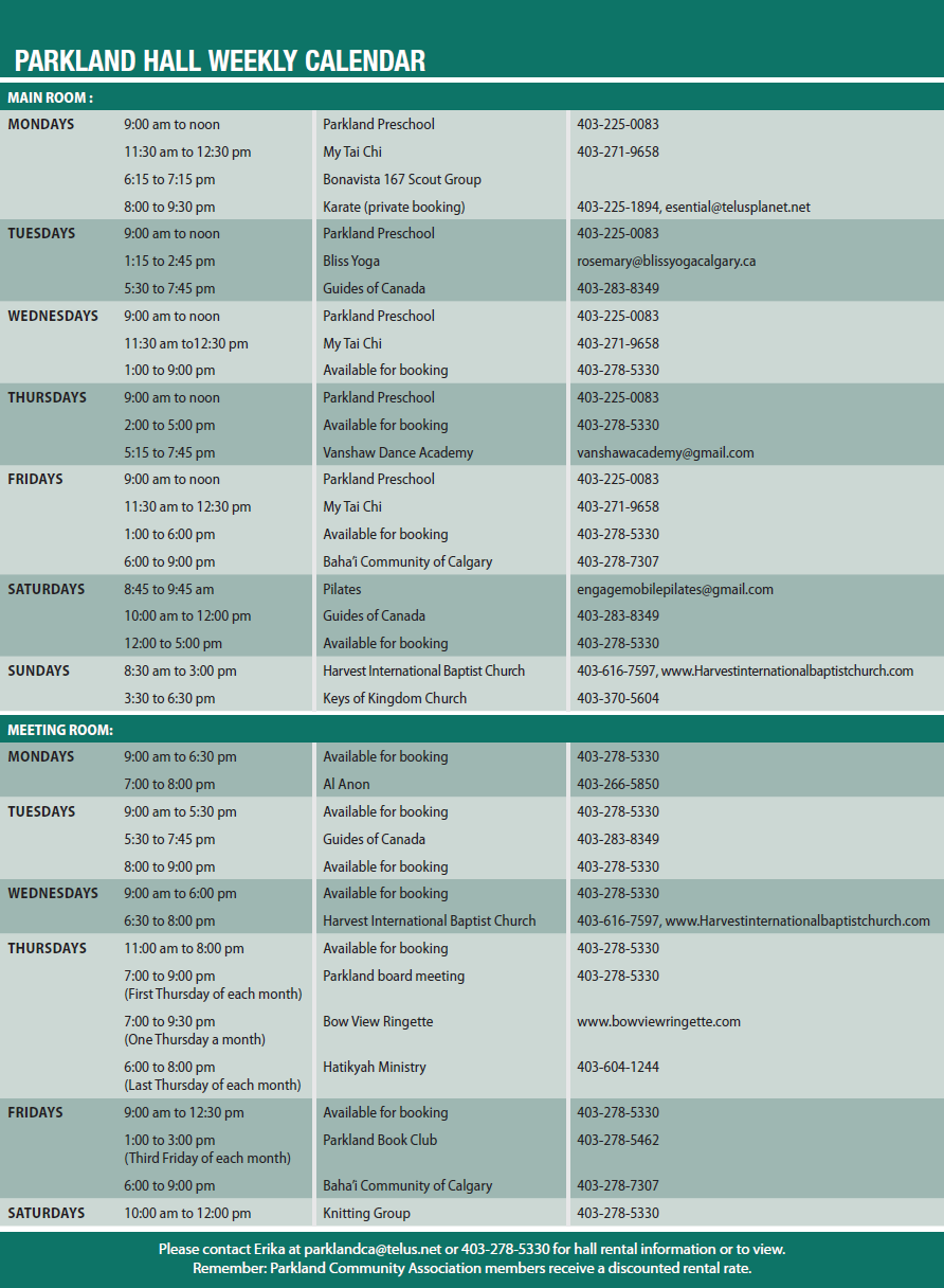SE CommunitiesParkland Parkland Hall Weekly Calendar By Parkland Community Association - October 6, 2025 0 4 Click here to the Parkland Community News home page for the latest Parkland community updates.
