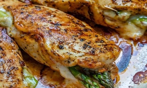4. Add three sprigs of asparagus and a couple of pieces of sun-dried tomatoes to a mozzarella slice, then roll it to hold them inside. Stuff the chicken breasts with it.