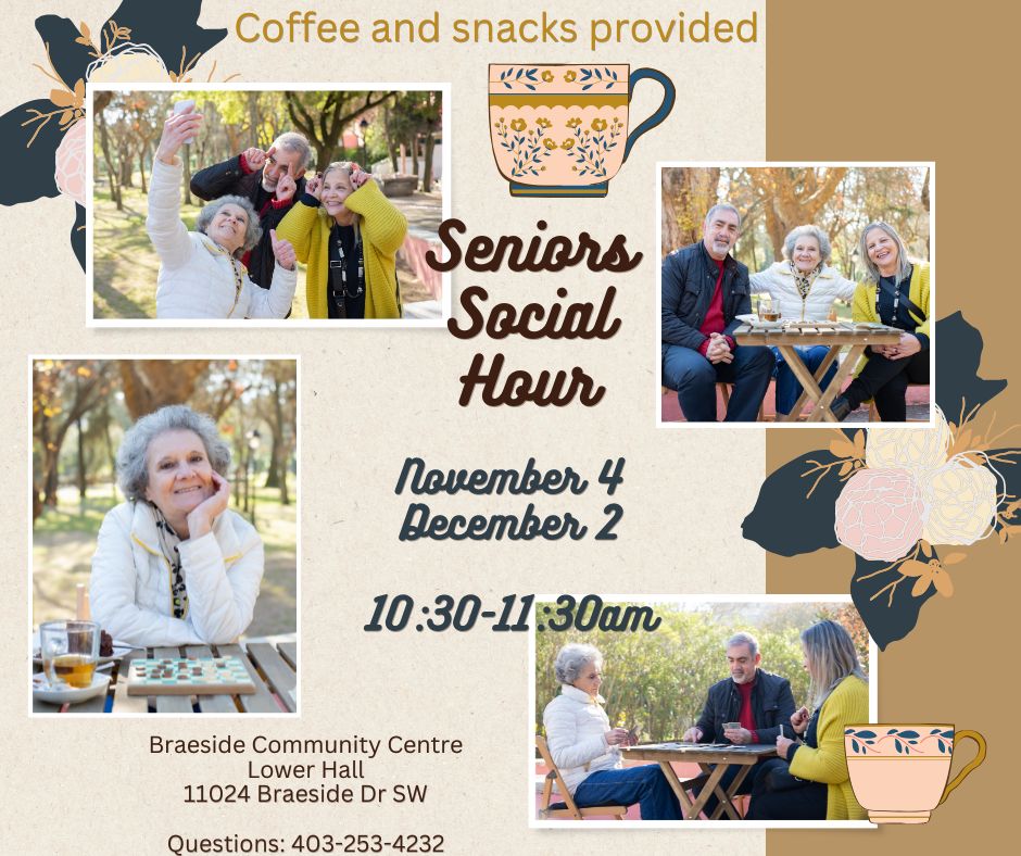 SW CommunitiesBraeside Braeside Seniors Social Hour – November and December Dates By Braeside Community Association - October 31, 2025 0 10 Click here to the Braeside Community News home page for the latest Braeside community updates.