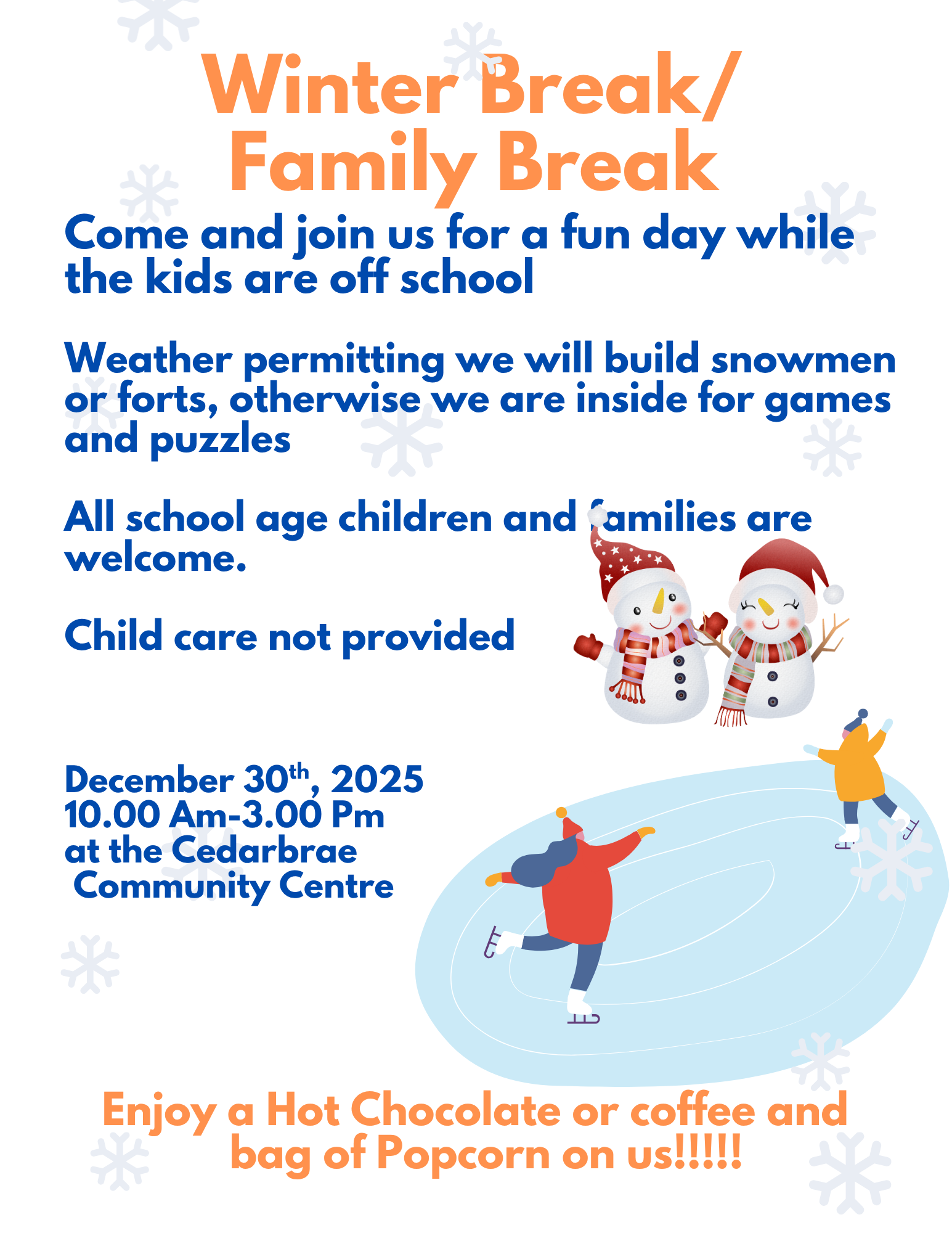 SW CommunitiesCedarbrae Winter Break/Family Break in Cedarbrae By Cedarbrae Community Association - December 5, 2025 0 1 Click here to the Cedarbrae Community News home page for the latest Cedarbrae community updates.