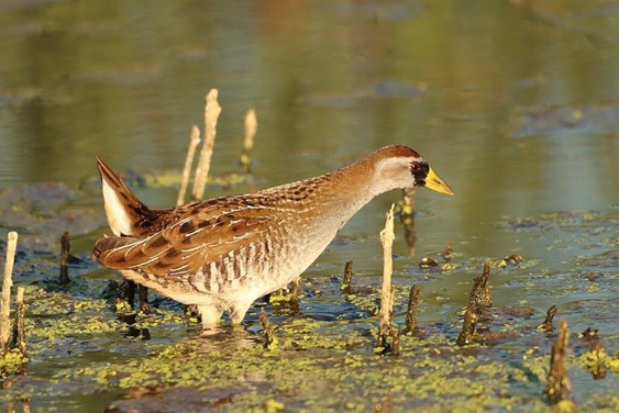 When a Sora walks it puts its head forward with each step as it looks for aquatic plant seeds or bugs to eat. It’s been known to use its long toes to rake the vegetation. Their long legs are great for running away really quickly, often you will just get a glimpse of them. A brown blur with a yellow streak.