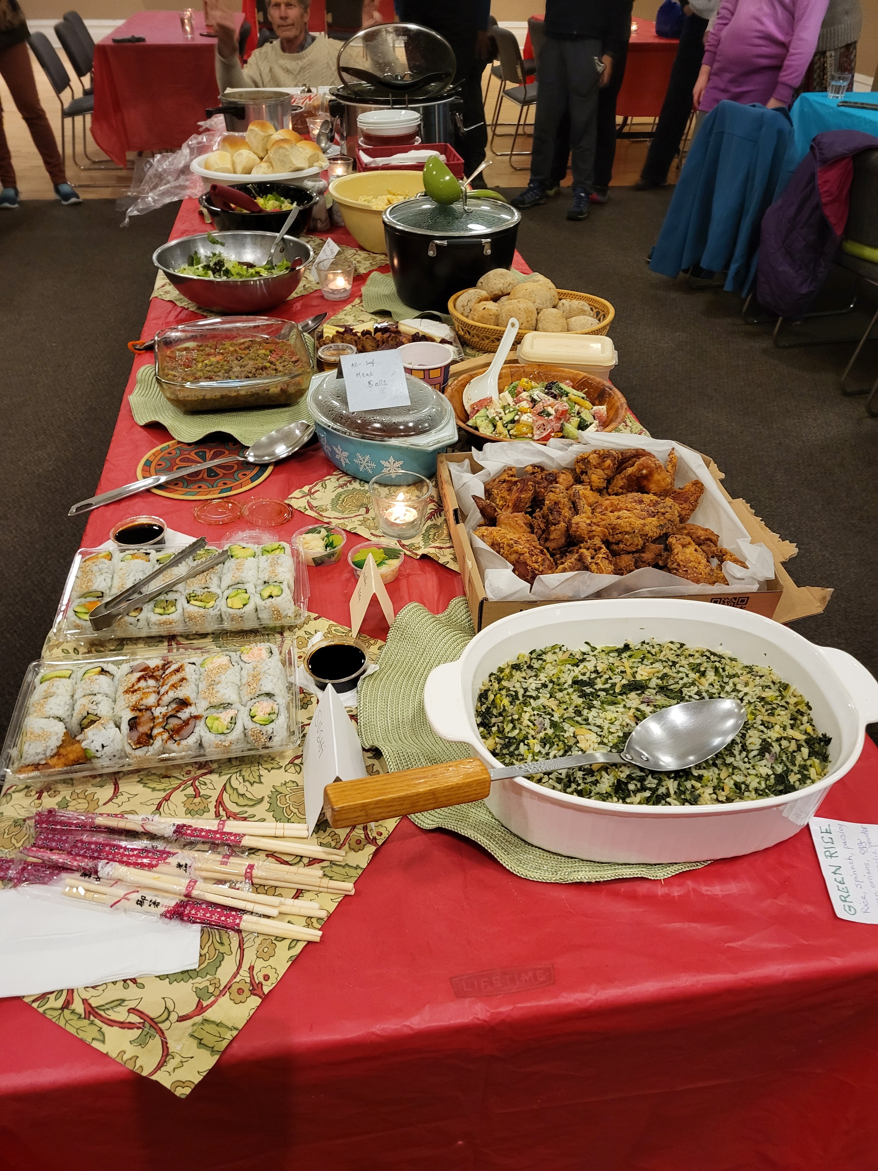 Here are a couple pictures from the January 11 potluck. You can see some of the delicious food.