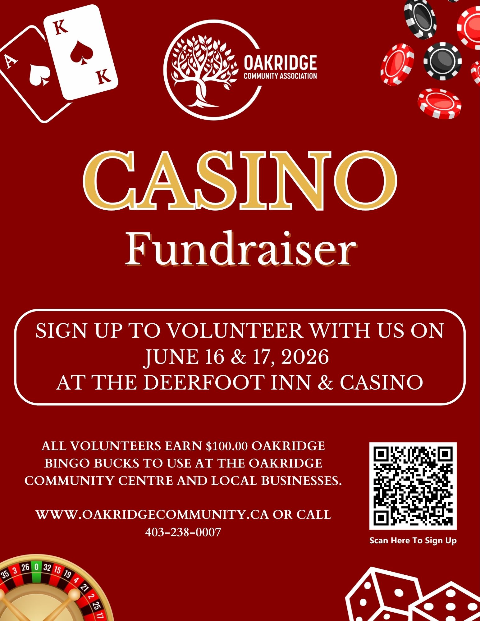 This fundraiser is only possible because of the amazing volunteers who step up to cover the various shifts required during casino dates. If you would like to volunteer your time, please visit www.oakridgecommunity.ca.