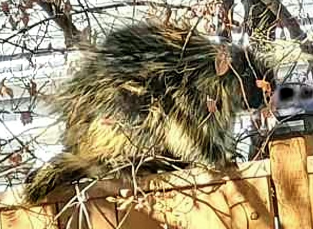 The porcupines here are the tree dwelling North American porcupines, which commonly live 5 to 7 years but can get as old as 10 to 12 years. While they tend to avoid humans, they are sometimes attracted to food sources in our yards. They eat plants, including leaves, berries, twigs, and roots in the summer, and inner tree bark and conifer needles in the winter. They have strong teeth and are known to gnaw on human-made items like wood and leather, which they do to sharpen their teeth and because of a craving for salt.